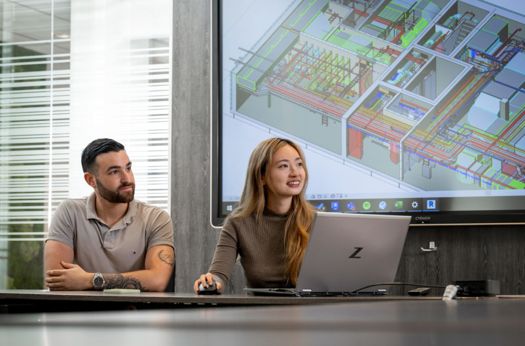 “Ik ben nu nog trainee, maar binnenkort kom ik in vaste dienst als BIM-modelleur. BIM staat voor Building Information Modeling en betekent dat je met de computer driedimensionale modellen maakt van installaties die straks in gebouwen komen. Ik ontwerp bijvoorbeeld luchtkanalen en riolering voor de utiliteitsbouw.”