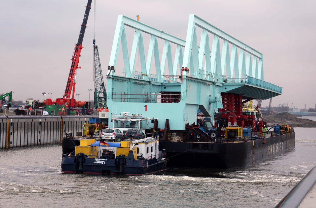 De bruggen – elk 86 meter lang, 17 meter breed, 15 meter hoog en 1540 ton zwaar – zijn ook één voor één op een ponton vervoerd en afgemeerd in het sluishoofd, ter hoogte van de brugkelder. Voordat de brug op zijn plaats kon worden geïnstalleerd, werd deze gevijzeld tot de correcte hoogte om deze in de juiste stand te draaien. Het contragewicht van de brug kwam daarbij precies boven de brugkelder uit, waarna de brug klaar was voor plaatsing en installatie.