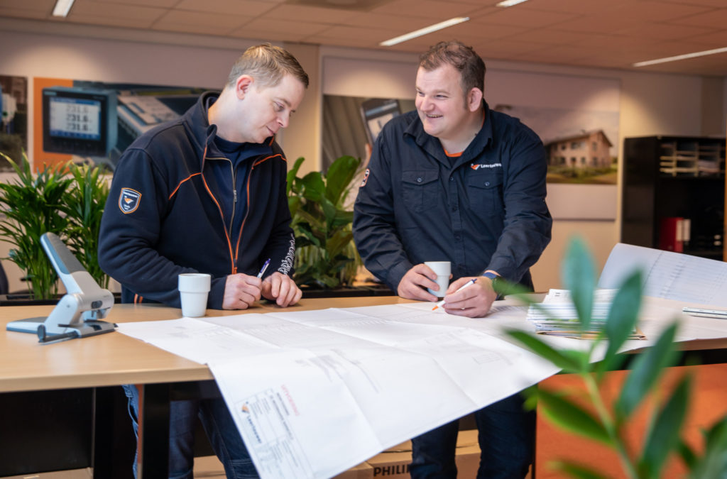 De koelsystemen monteert Leertouwer op de buitenring, hoog in de toren. Van der Velde: “In Markelo moest dat op de vijfentwintigste verdieping. Dan sta je op 110 meter; ongeveer even hoog als de Domtoren! In Tjerkgaast staat de toren aan de rand van de Friese meren. Als je dan aan het eind van de dag beneden komt, heb je het idee dat je de hele dag op een bootje op zee hebt gezeten. Als het hard waait, voel je de toren heen en weer gaan. Daar krijg je zeebenen van.”