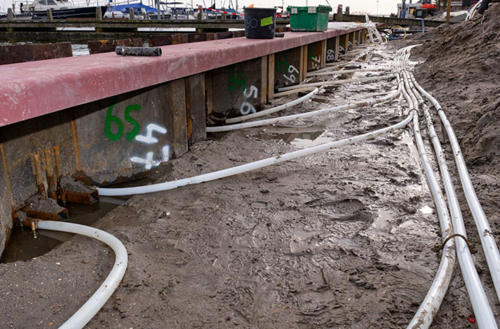 Daarbij komt een recente uitvinding goed van pas: de ‘energie-damwand’. Dat is een stalen damwand waaraan een warmtewisselaar is gelast, waarover we op dit platform eerder al een interview hadden met Dook Ligthart van advies- en ingenieursbureau Lievense | WSP. Via een gesloten systeem van collectoren en leidingen waarin een vloeistof stroomt (water met antivries) haalt die warmte uit oppervlaktewater én uit grondwater. Dankzij die combinatie levert zo’n energie-damwand of -kademuur ook bij lagere buitentemperaturen voldoende warmte op om woningen te verwarmen.