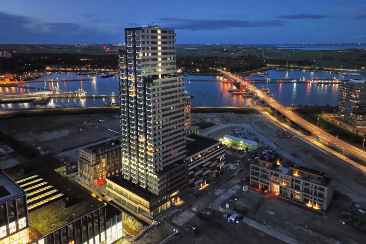 ‘Normaliter maak je een hoog gebouw aardbevingsbestendig door het op rubbers te zetten. Maar dit gebouw helt voorover. Dan zouden de rubbers aan de ene kant extra druk ondervinden, terwijl aan de andere juist wordt getrokken. Dat kon dus niet. De oplossing werd gevonden in het toevoegen van heel veel staal.’