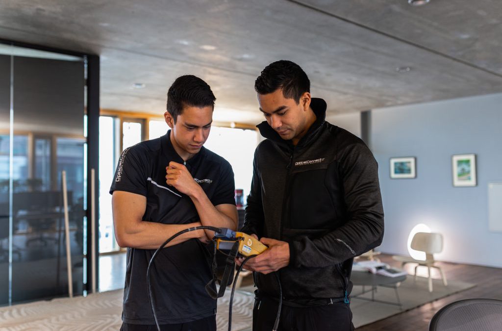 Glasvezel wordt vrijwel altijd gelegd in buizen. Eric Beijleveldt van OpticalConnect: “Daarbij wordt eerst de buis gelegd en ‘blazen’ we er vervolgens de glasvezeldraad doorheen, tot diverse kilometers lang uit één stuk, zonder koppelingen of lasverbindingen.” Dat blazen is een vak op zich. “We sturen lucht onder hoge druk door de leiding, samen met de nieuwe kabel. Door de ‘windkracht’ gaat de kabel zweven in de buis en kunnen we die zonder weerstand kilometers ver invoeren. In de tunnels van de Betuwelijn is dat zelfs gelukt tot een recordafstand van 8 kilometer!”, vertelt de installateur trots.